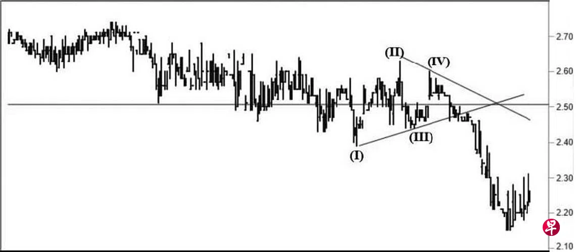 本栏于今年8月11日曾论及这只股票当时正处具五波走势的C大波中第(1)波中的第(V)波跌势,填补介于2.40元与2.39元及介于2.30元与2.29元的缺口也就水到渠成。当时股价为2.48元左右。8月18日股价骤然上升至2.60元,造成介于2.52元与2.47元间出现缺口;9月5日股价下探2.46元,遂将此缺口填补。回顾股价自今年6月15日下跌至2.39元后,就于当天以“主要转向”信号完成了一个跌势“三角形”中的第(I)点,接着回扯至7月25日的2.63元,此为第(II)点。8月4日股价回落至2.44元结束了第(III)点,过后回扯至上述的2.60元完成了第(IV)点。9月12日股价终于跌穿位于2.48元的“三角形”下限,若以此“三角形”的高,计自其下限,可测得基本目标为2.28元。10月10日股价不但跌穿此基本目标的价位,直试2.22元,同时也将上述第一及第二个缺口全予填补。截至10月25日股价已经下跌至2.15元。短期回扯,股价或将以三波向上调整,并可能试2.50元的阻力线后,重返跌势。