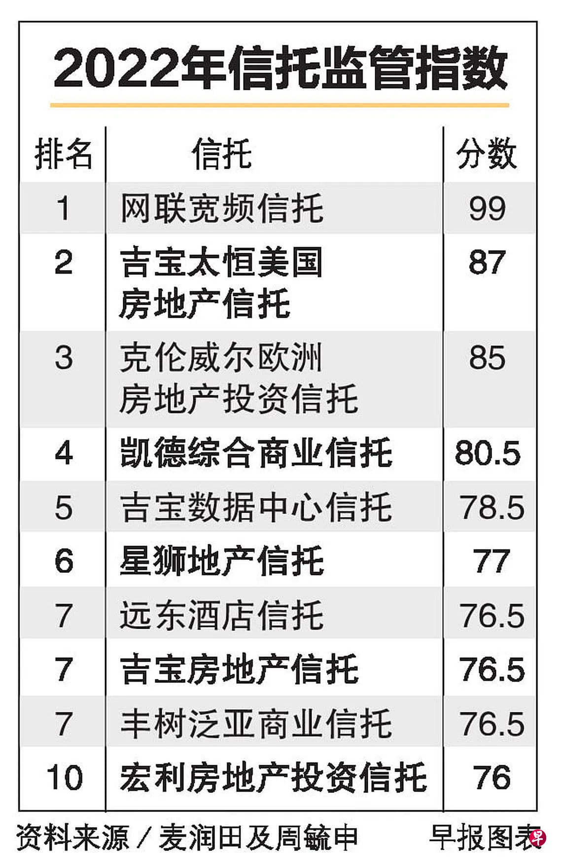 根据在星期四(11月17日)公布的2022年信托监管指数(Governance Index for Trusts)报告,网联宽频信托从43个在新加坡交易所挂牌的房地产投资信托、商业信托和合订信托之中脱颖而出,以99分的高分稳坐冠军宝座。今年的成绩还高于去年的95分。