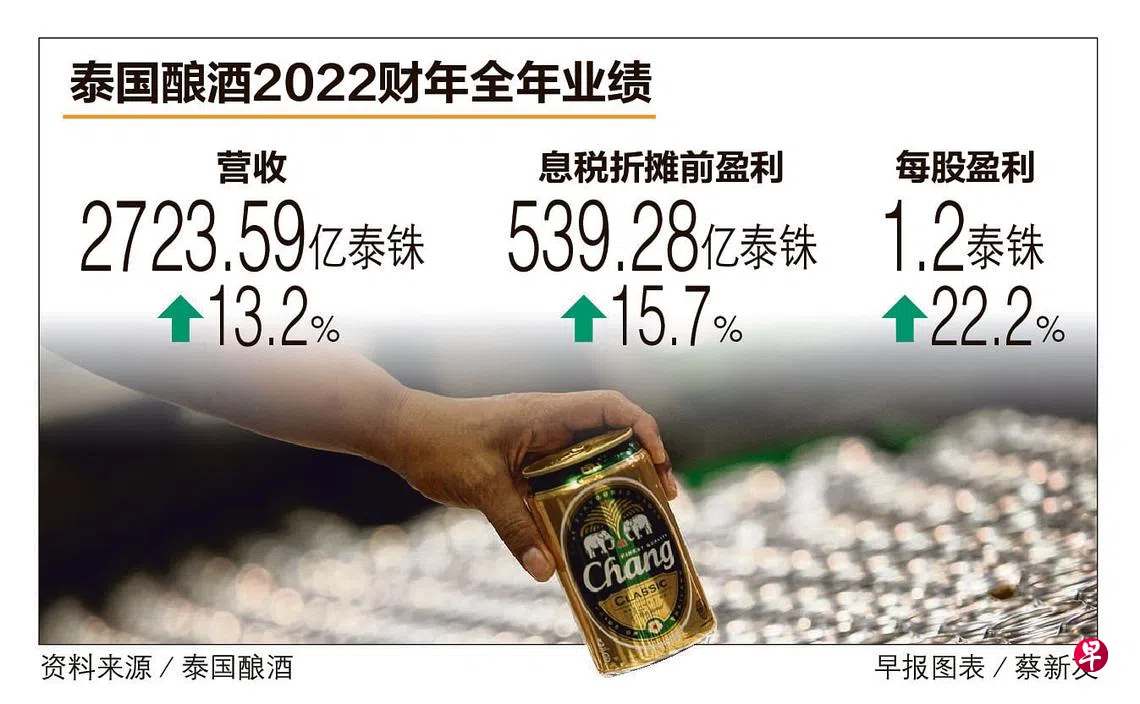 泰国酿酒星期五(11月25日)闭市后发布的2022财年全年业绩报告显示,集团营收同比增加13.2%至2723亿5900万泰铢,息税折摊前盈利(EBITDA)同比增长15.7%至539亿2800万泰铢,这是因为啤酒、非酒精饮料、食品业务和关联公司的EBITDA取得令人满意的改善。