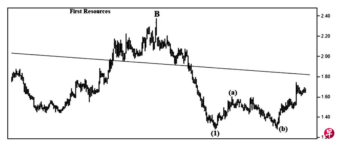 本栏于今年4月1日曾论及这只股票由于升势甚急,造成介于1.88元与1.86元间出现缺口,短期回扯,股价或将填补这缺口后,重返升势。当时股价为2.06元左右。见报当天股价一度下试1.98元,过后渐渐回升。4月22日股价上升至2.29元,25日股价骤然下跌至2.11元,随即在介于2.18元与2.25元间出现缺口;27日股价回升至2.25元,遂将此缺口填补。5月5日股价上升至2.37元,可惜却于当天以近乎全天最低的2.22元闭市,而成了“转向”信号。6日股价下跌至2.10元,同时在介于2.18元与2.22元间留下缺口,5月20日股价回扯至2.20元,旋将此缺口的大部分填补,过后缓缓下滑。5月31日股价竟以1.94元闭市,较4月底闭市的2.13元来得低,遂于其每月一杆图以“主要转向”信号为左图中的B波画下句号,同时进入具五波的C波跌势。7月26日股价下探1.28元完成了第(1)波,接着进入具三波的第(2)波回扯,估计股价目前正处(c)波回扯,能否升试1.82元的阻力线后才下跌,投资者只能拭目以待。