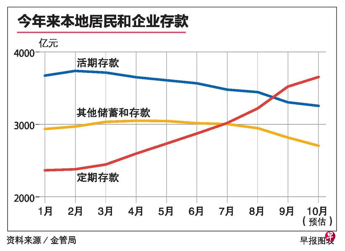 市场利率今年来节节攀升,各类定期存款和高收益率产品吸引资金,本地居民和企业的活期存款户头存款从2月份以来一路下滑,已经减少了13%,但定期存款今年来大增56%。