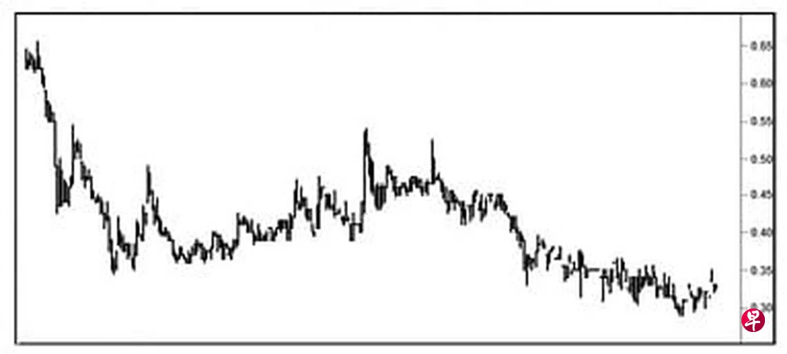 本栏于今年6月18日曾论及这只股票每月一杆图中的“动力”信号已日渐式微,估计股价一旦跌穿位于0.36元的支撑点,当有骤跌。当时股价为0.41元左右。果然,股价过后渐渐下跌,6月22日终于跌穿上述位于0.36元的支撑点,23日更下探0.33元,并于当天以“转向”信号进入短期回扯。6月30日上升至0.395元,无奈后劲不足,旋即转而回落,7月7日下跌至0.35元,由于跌势较急,造成介于0.37元与0.38元间出现缺口;7月14日回升至0.38元,遂将此缺口填补。7月20日股价回落至0.365元,又在介于0.365元与0.38元间出现缺口;26日回升至0.38元,随即将此缺口填补。7月28日下探0.335元,同时在介于0.355元与0.365元间出现缺口;8月2日回扯至0.37元,旋将此缺口填补,此后缓缓下滑。11月3日股价已经下试0.29元,并于当天以“主要转向”信号止跌回升。短期回扯,或将升试0.43元的阻力线,一旦升逾0.54元,股价当重返升势。