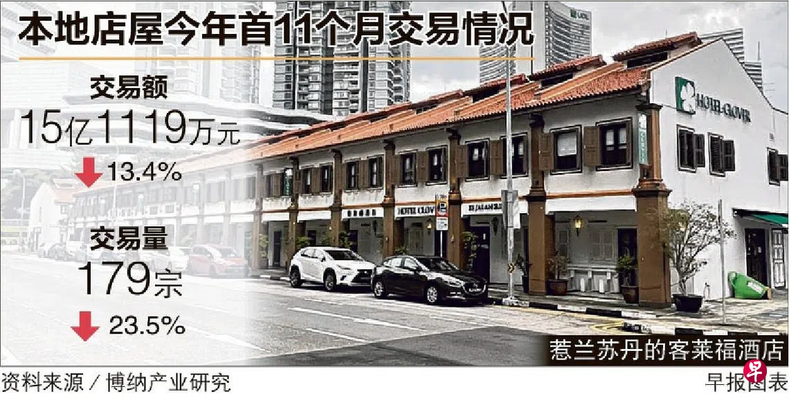 本地店屋市场出现价格落差,不少业主选择持有店屋资产来赚取租金,造成今年来店屋交易额比去年同期下跌13.6%。市场人士认为,本地店屋供应减少,加上宏观经济环境不稳,明年交易额可能继续放缓。