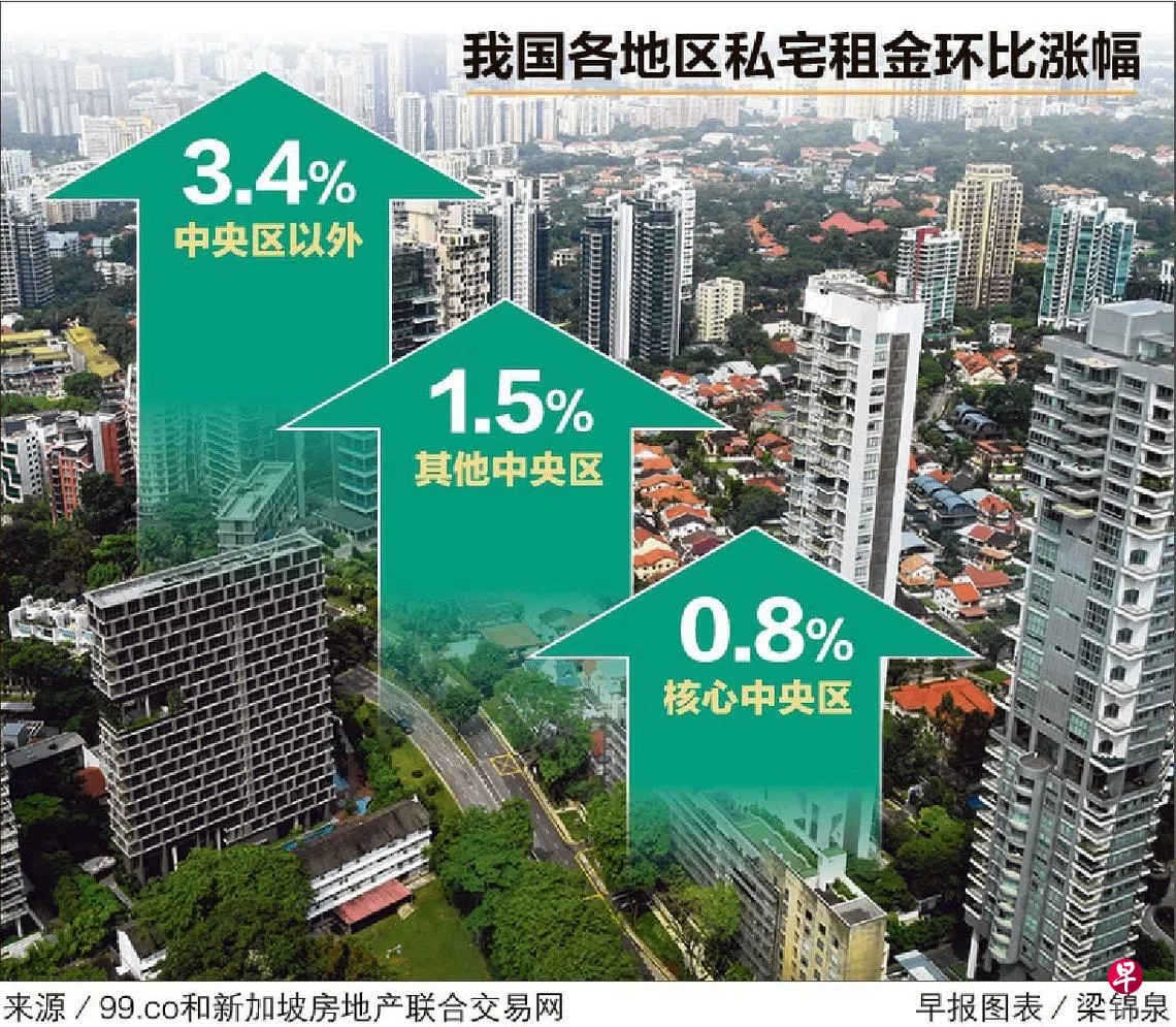 房地产网站99.co和新加坡房地产联合交易网(SRX)星期三(12月14日)发布的11月份预估数据显示,租金涨幅最大的是中央区以外的大众化私宅(OCR),环比上涨3.4%。其他中央区(RCR)的中档私宅和核心中央区(CCR)的高档私宅租金则分别上升1.5%和0.8%。