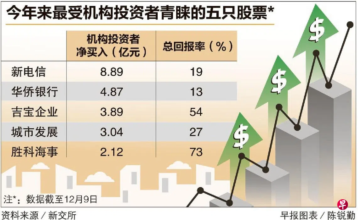 新加坡交易所(SGX)日前发布的研究报告显示,截至12月9日,今年来吸引最多机构投资者的20只股票,资金流入共计36亿元,它们的平均总回报率为35%。这20只股票,当中17只跑赢大盘,总回报率呈双位数甚至超过一倍,高于海峡时报指数的8%。