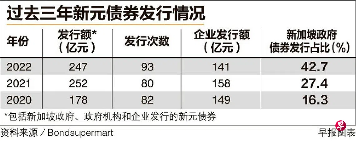 新元债券今年来发行93批 总额247亿元比去年少2%订户赠阅文章全球利率高涨,经济展望不利,今年的企业债券发行减速,本地新元债券发行主要由政府债券支撑。根据债券交易平台Bondsupermart提供的数据,今年至今共有93批新元债券发行,稍微高于去年的80批,但是发行额为247亿元,比去年的252亿元少2%。Bondsupermart环球固定收益研究部分析员黄迪明指出,今年一大部分的新元债券发行来自新加坡政府。数据显示,新加坡政府发行的债券占比今年达42.7%,去年则是27.4%。回顾与展望债券利率新元投资理财上一篇登加区推出EC地段招标下一篇评股论经购买此文章