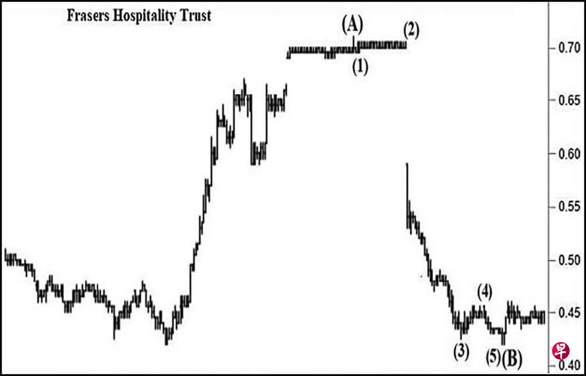 本栏于今年6月10日曾论及这只股票其“动力”信号随时会穿上“中性线”进入正号界域,迄时当带领股价填补介于0.72元与0.735元间的缺口。当时股价为0.66元左右。6月13日股价骤然上升至0.695元,14日更升试0.70元,过后进入一段很长的横摆走势。8月2日股价一度升试0.71元,无奈这仅是昙花一现,过后重返横摆走势。从8月3日至9月9日股价仅在0.705元及0.695元间这狭小波幅中波动。9月13日股价跳空直试0.53元,遂在介于0.59元与0.705元间留下缺口,因此,估计上述的0.71元高位,应是C波中的(A)波,而(B)波又具五波。其中8月5日的0.695元为第(1)波,接着回扯至9月9日的0.705元则为第(2)波。10月21日股价下探0.425元完成了第(3)波,旋回扯至11月9日的0.455元结束了第(4)波,而第(5)波终于在11月24日下试0.42元时,以“转向”信号完成,同时为(B)波画下句号。估计股价已经进入(C)波升势,填补上述第二个缺口也就水到渠成。