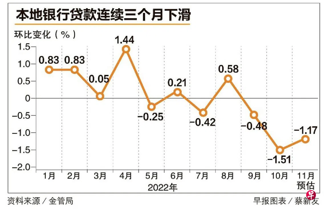 银行贷款11月环比跌1.17% 明年贷款增长料放缓订户赠阅文章本地银行贷款连续三个月下滑,今年11月环比下跌1.17%,比去年同期上升0.67%。货币政策收紧、高通货膨胀和地缘政治紧张局势,导致全球经济放缓或陷入衰退的风险加剧。经济师一致认为,这可能影响本地银行贷款活动,2023年的贷款增长预计放缓。新加坡金融管理局星期五(12月30日)公布的预估数据显示,本地银行贷款在11月份环比下跌1.17%,贷款总额为8165亿元。若与2021年同期相比,贷款总额上升0.67%。贷款银行银行贷款上一篇约50新私宅项目明年推出 提供超过1万2000个单位下一篇按图索骥购买此文章