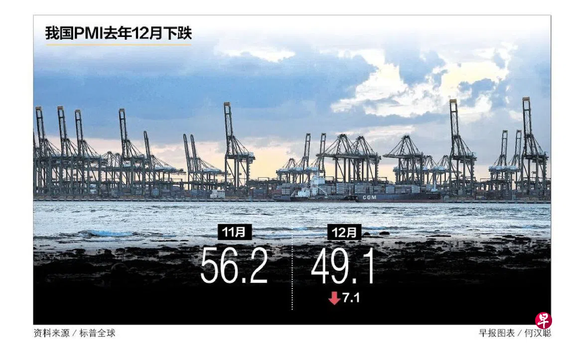 标普全球(S&P Global)星期四(1月5日)发布的12月份新加坡采购经理指数(PMI)显示,我国整体PMI从去年11月的56.2,下跌至49.1。