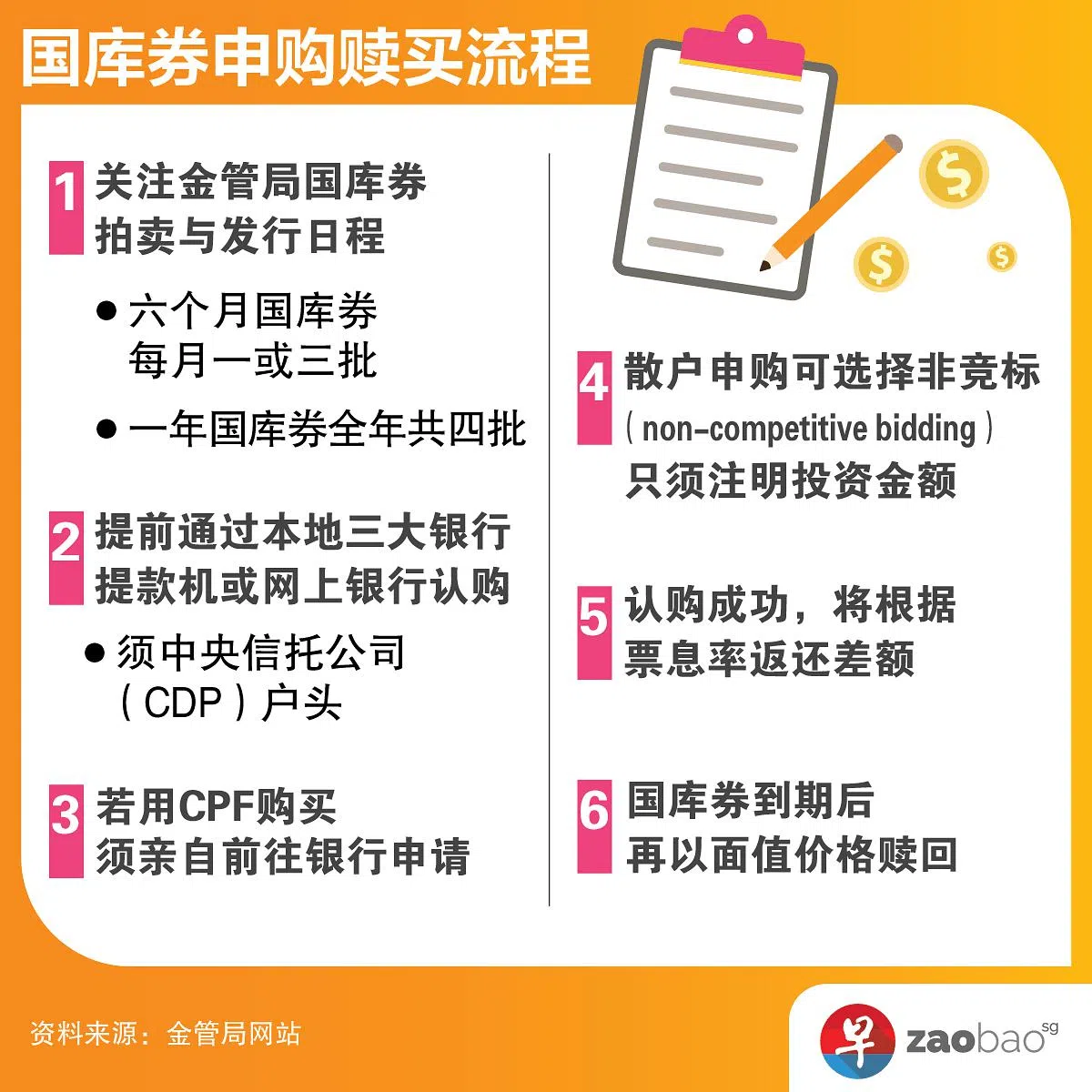 要申购国库券,投资者须持有中央信托公司(CDP)户头,并连接至自己的银行账户。投资者便可通过本地三大银行的提款机或网上银行申请申购国库券。要留意的是,对于个人投资者,申请截止日通常在拍卖日前一到两个工作日,有意申购者应同各自银行确认截止时间,以免错过。