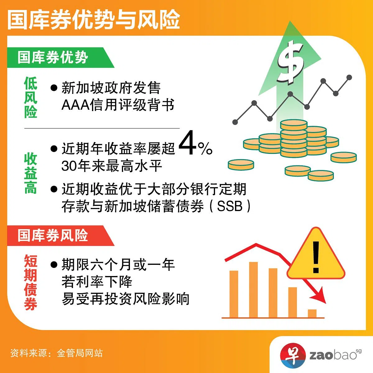 国库券(Treasury Bills,简称T-bills)是新加坡政府发行的三种债券之一,相较于新加坡储蓄债券(Singapore Savings Bond,简称SSB)或商业银行定期存款,国库券近期收益表现优异,因此备受投资者青睐。