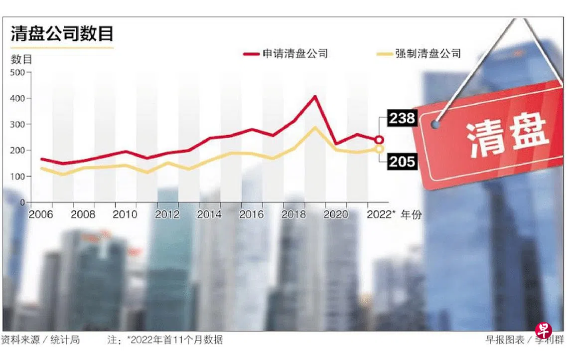 我国每年清盘的公司数量在经历两年逆势走低后,已有上升之势。根据统计局数据,我国2022年首11个月强制清盘的公司计达205家,已超过2021年全年的191家和2020年的201家。