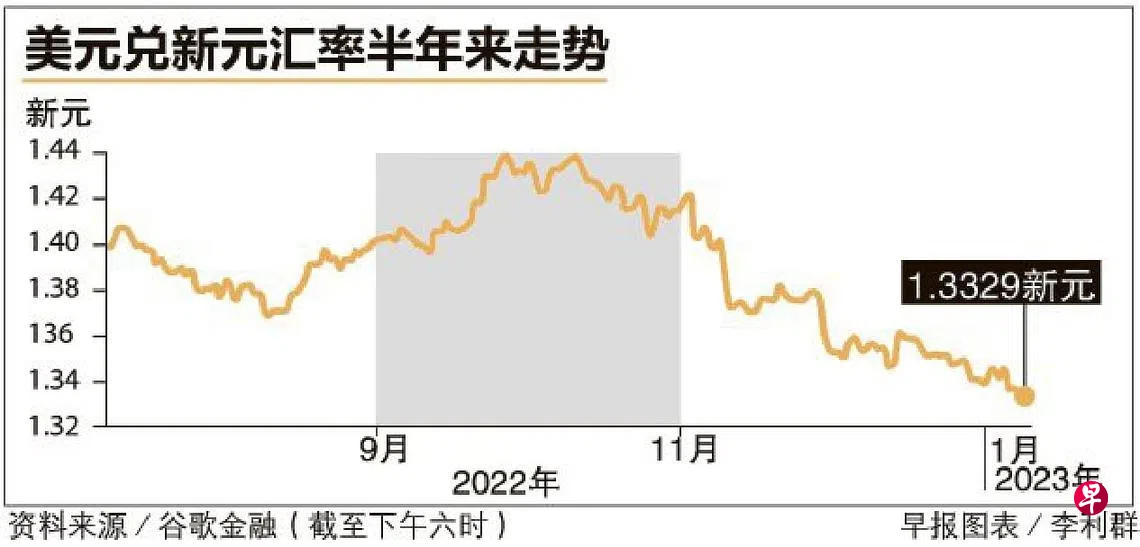 美国通货膨胀出现缓和迹象,市场对美国联邦储备局放慢加息的期望提高,促使美元兑新元汇率过去一个月下跌接近1.7%,六个月以来跌逾4%。分析师预期,如果联储局暂停或放缓加息的同时,新加坡金融管理局再次收紧货币政策,美元预料进一步走软。