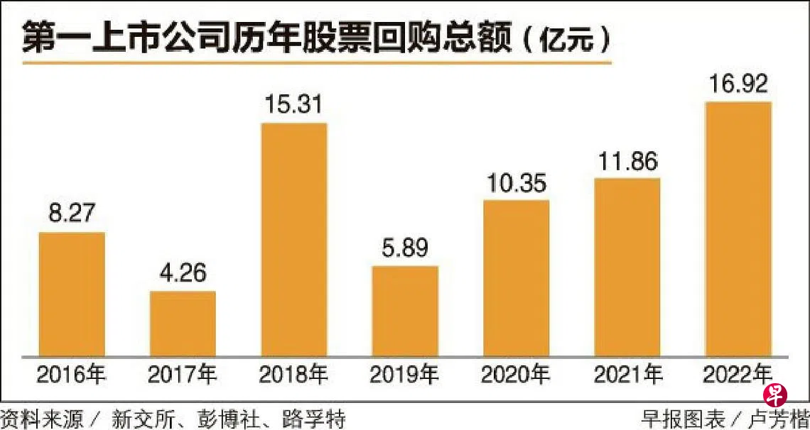 在新加坡交易所第一上市的公司在2022年进行的股票回购总额达16亿9200万元,比2021年的11亿8600万元和2020年的10亿3500万元都高。