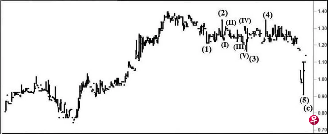 本栏于2021年11月17日曾论及这只股票当继续下滑以填补介于1.145元与1.09元间的缺口,并在完成(c)波后重返升势。当时股价为1.26元左右,可是股价并没有立即下滑,而是以五波走势形成(c)波。11月26日股价上升至1.35元完成了五波中的第(2)波,遂进入具五细波的第(3)波。12月9日股价下跌至1.23元完成了第(I)细波,12月14日股价骤然上升至1.28元,同时在介于1.26元与1.23元间留下缺口。12月20日股价升试1.31元结束了第(II)细波。2022年元月31日股价下跌至1.22元,旋将上述第二个缺口填补。3月1日股价下探1.21元完成了第(III)细波。3月9日股价下探1.16元完成了第(V)细波,同时为第(3)波画下句号。5月23日股价回升至1.35元结束了第(4)波。12月20日股价下试0.91元,随即于当天以“主要转向”信号完成了第(5)波,且为(c)波画下句号,同时也将上述第一个缺口填补。估计股价升势在即,填补介于1.10元与1.17元及介于1.18元与1.24元的缺口,也就水到渠成。