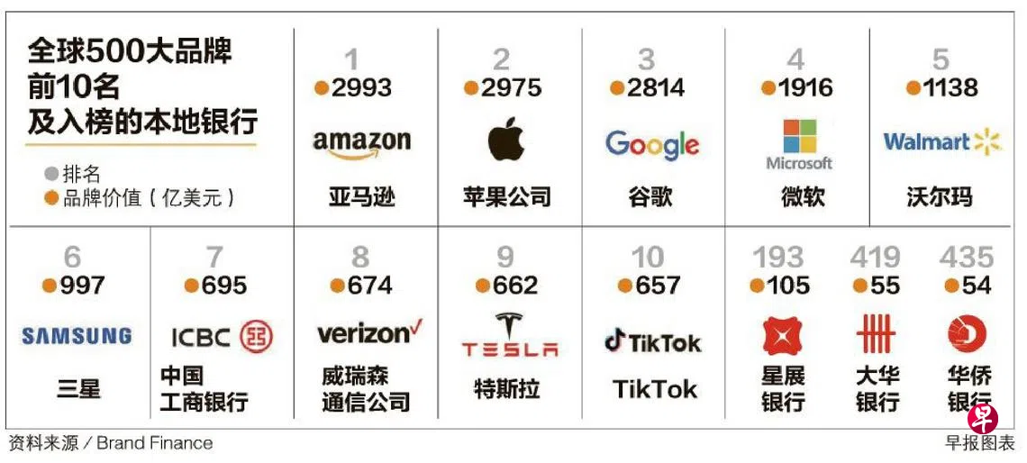 总部在伦敦的国际品牌估值咨询公司Brand Finance星期三(1月18日)公布全球500大品牌的最新排名,星展银行从去年234位上升至今年193位。大华银行从去年468位上升至今年419位,华侨银行从去年482位上升至今年435位。