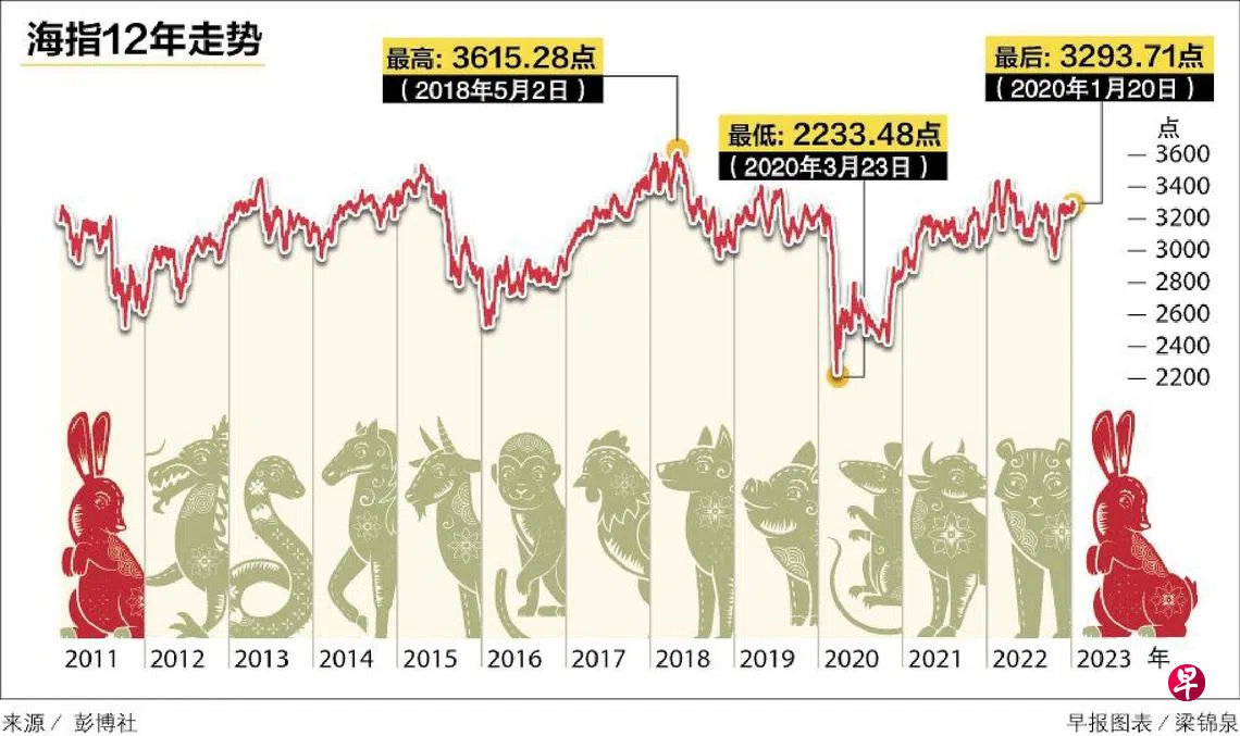 本地股市的历史并没经历多少个兔年,作为股市晴雨表的海指,历史更短,上次遇上农历兔年时,海指于2011阳历年全年大跌17%,但只此一次不成规律。纽约股市的道琼斯指数过去的10个兔年,有八次上涨,最近一次在2011年涨5.5%;标普500股指过去七个兔年,有六次上涨;纳斯达克指数过去四个兔年,仅两次上涨。