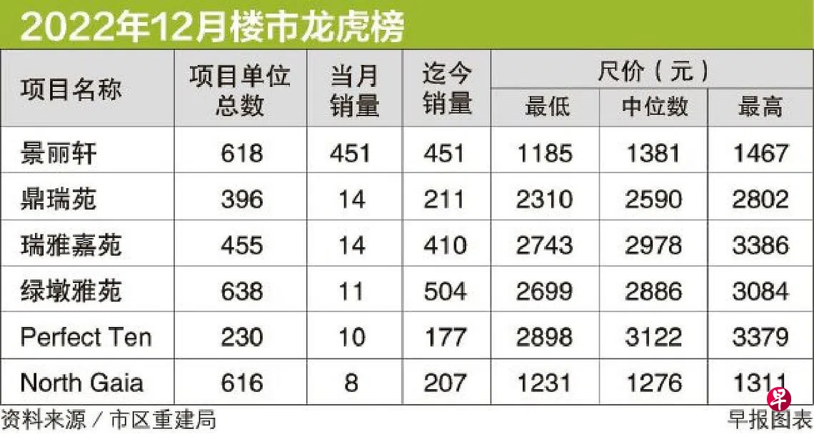 景丽轩由青建地产(Qingjian Realty)、三达利建筑(Santarli Construction)和喜敦控股(Heeton Holdings)合资打造,共有618个单位,上月卖出451个单位或73%,中位数每平方英尺售价1381元。
