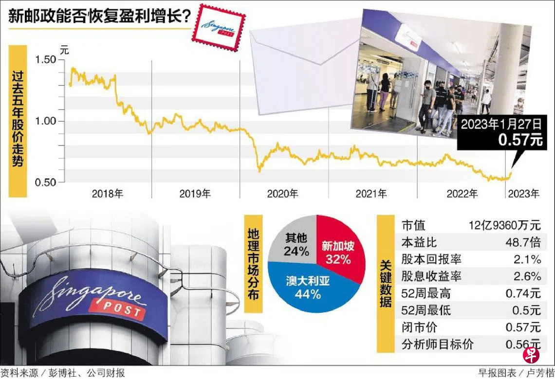 新邮政股价去年10月跌至14年低点后,今年来稍微回弹。集团今年起调高邮资,日前宣布了一些收购和脱售消息,要重点拓展澳大利亚市场。加上中国经济重新开放,这只沉寂多年的股是否有潜力恢复股息增长?新邮政在2015年曾因为电商巨头阿里巴巴的入股,股价被推高到超过2元,之后爆出企业治理问题,再加上收购的美国公司表现连年不佳最后清盘,股价节节败退,去年10月一度跌至0.5元,今年来上涨9.6%。