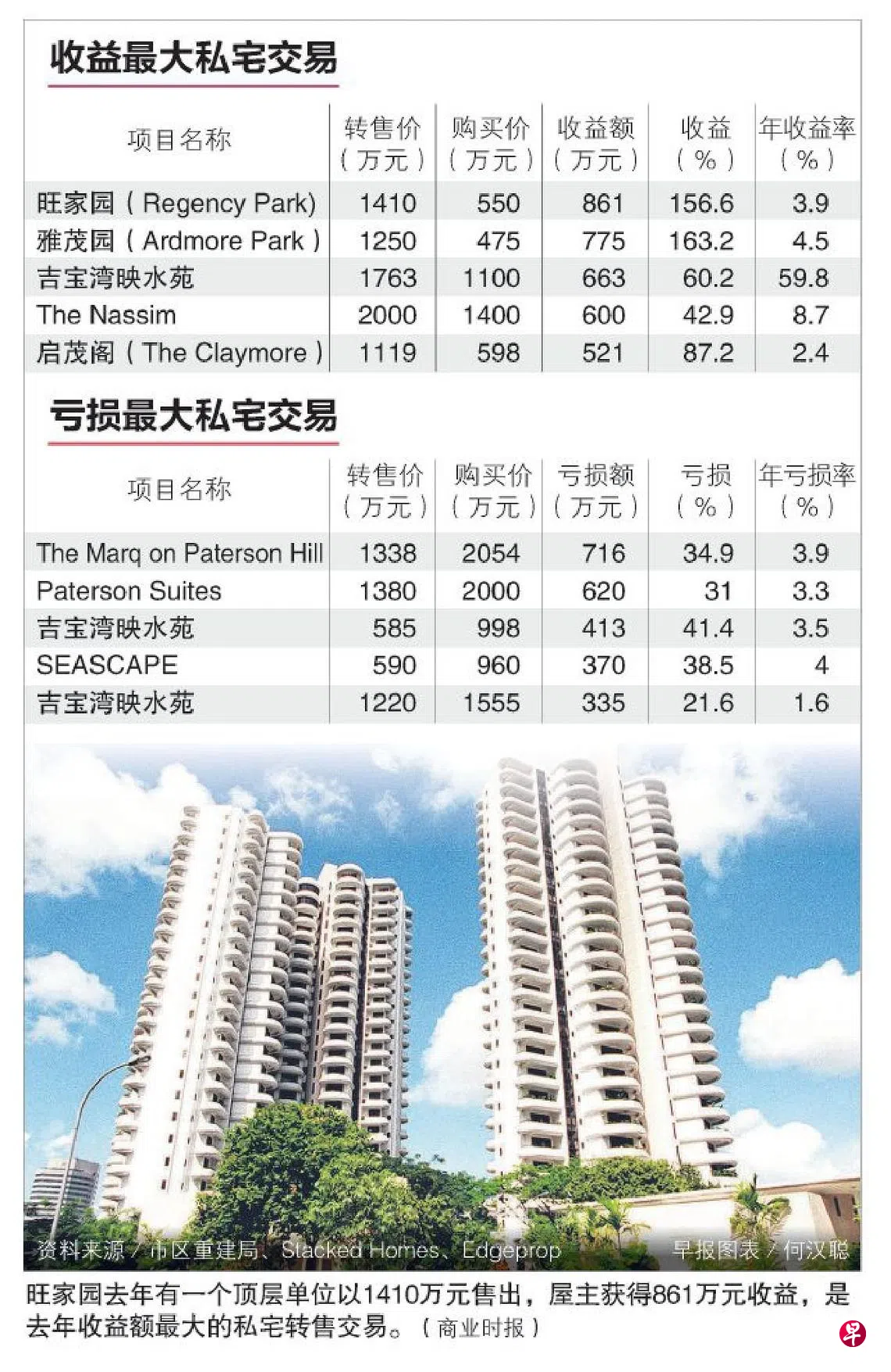 房地产平台Stacked Homes统计数据显示,去年1万3971个非有地私宅转售或楼花转售(sub-sale)交易中,只有5.25%的交易亏损,0.2%持平,其余近95%都获利,其中赚最多的一宗交易,收益额高达861万元。