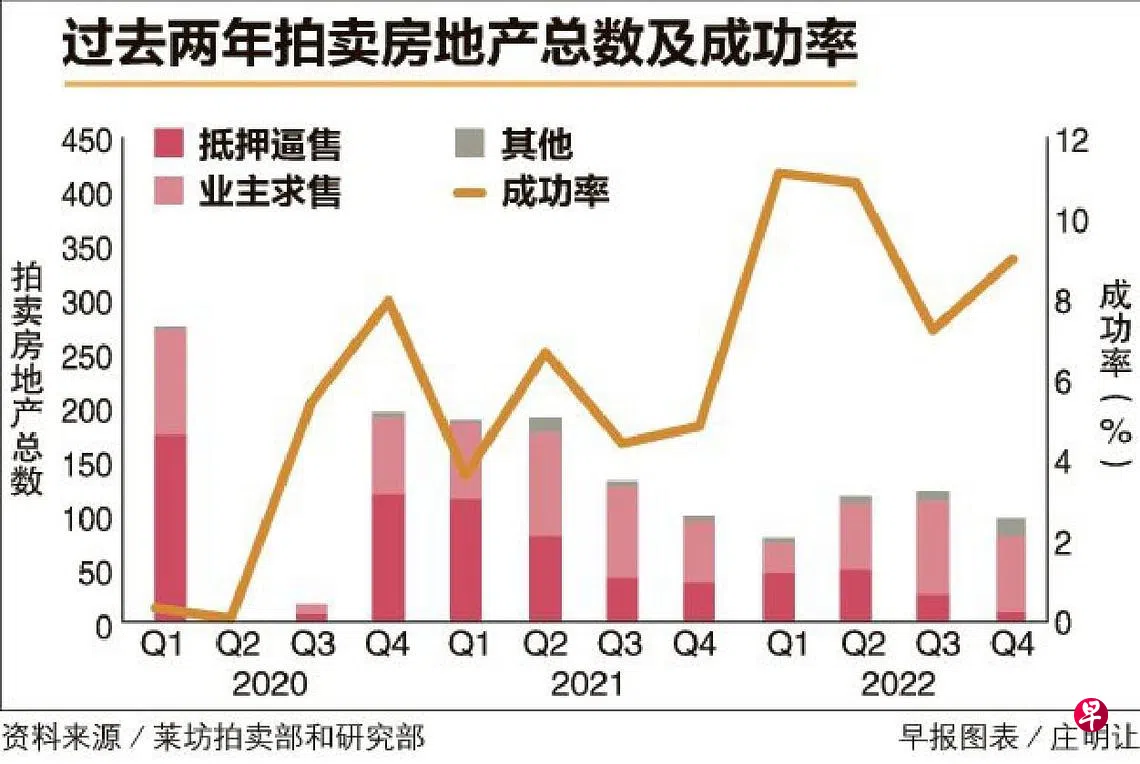 莱坊报告:去年达9.5% 房地产拍卖成功率写新高订户赠阅文章莱坊最新报告显示,以去年全年来看,拍卖的整体房地产数量同比减少31.9%至420个,但成功拍卖率创下有记录以来的新高,达到9.5%,共有40个房地产敲槌售出,总交易额达9030万元。本地拍卖的房地产数量减少,但成功率更高,交易额也增加。去年第四季拍卖的房地产数量环比下跌19.5%至99个,但交易额增加6.3%至2010万元。由于今年经济前景不佳,市场分析师预计今年拍卖的房地产数量预计会增加。房产交易额上一篇市场静待联储局会议决策 海指跌15.92点下一篇评股论经购买此文章