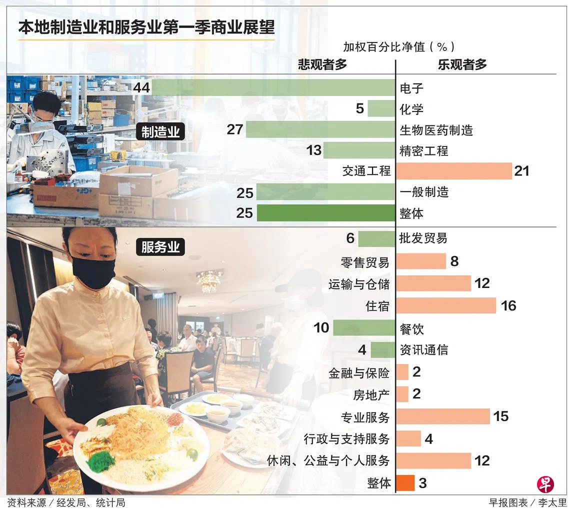 新加坡经济发展局星期二(1月31日)发布的今年第一季制造业商业展望调查报告显示,只有6%(加权比率,下同)的制造业者认为今年1月至6月的商业前景将改善,低于前一季的8%;预期商业情况更疲弱的业者却多达31%,高于前一季的28%。