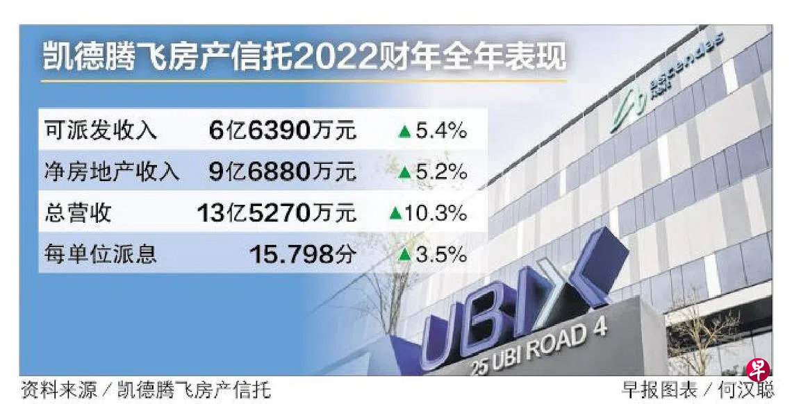 凯德腾飞房产信托(CapitaLand Ascendas REIT)受益于需求上升和收购项目带来的收入,在2022财年下半年的可派发收入同比增长4.5%至3亿3320万元;每单位派息7.925分,同比增长4.3%。