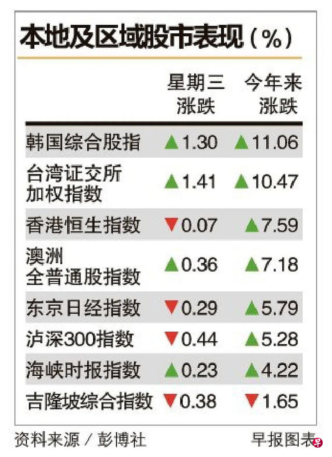 受美股上扬推动,台湾和首尔股市涨幅最显著,各涨1.41%和1.3%,新加坡和悉尼股市的涨幅不超过0.36%。香港、首尔、中国和吉隆坡股市的跌幅不超过0.44%。