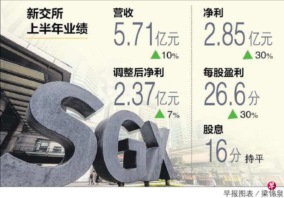 在衍生品交易量和资金交易收入带动下,新加坡交易所(SGX)截至2022年12月底的上半财年净利同比扬升30%至2亿8500万元,每股盈利26.6分,营收增加10%至5亿7100万元。