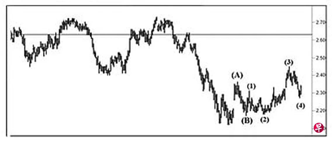 本栏于去年11月17日曾论及这只股票当时正处于三波回扯,填补介于2.37元与2.38元间的缺口自不在话下,并可能升试2.63元的阻力线,过后向下填补介于2.26元与2.18元间的缺口。当时股价为2.31元左右。可是股价过后并没有立即上升,而是继续下滑。11月28日股价一度下试2.17元,遂将上述第二个缺口填补,同时为上图中的(B)波画下句号,旋止跌回升,并进入具五波的(C)波。同年12月1日股价上升至2.31元完成了第(1)波,接着以三波下调。12月20日股价下跌至2.18元,次日,股价再试此价位未果,随即以“转向”信号完成了第(2)波,遂进入第(3)波升势。今年元月25日股价跳空上升至2.38元,旋将上述第一个缺口填补,同时也在介于2.33元与2.31元间留下缺口。元月30日股价升试2.45元,且于当天以“转向”信号为第(3)波画下句号。2月13日股价下试2.27元结束了第(4)波,估计股价目前已经进入第(5)波升势,升逾2.45元的价位也就理所当然。