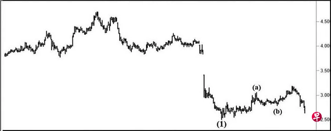 本栏于去年11月10日曾论及这只股股价自2018年元月19日升试5.85元后,就进入三大波跌势,估计股价已进入C大波跌势,挑战2.04元的重大支撑点将是基本目标。当时股价为2.68元左右,见报当天股价跳空下试2.54元,随即在介于2.67元与2.72元间留下缺口;14日回升至2.77元,遂将此缺口填补,过后缓缓上升。同年12月12日股价升试3.05元,旋于当天以“主要转向”信号完成了图中的(a)波,接着以三波下调,今年元月11日股价下试2.78元结束了(b)波,过后进入(c)波升势。2月2日股价升试3.18元,估计短期升势将会持续,填补介于3.41元与3.87元的缺口指日可待。回顾股价自上述的4.70元(2022年4月28日)下跌以来,倘若去年10月25日的2.49元为第(1)波,那么股价目前正处第(2)波回扯,因此,股价随时会为第(2)波画下句号,而进入第(3)波跌势,跌穿2.49元的支撑点当无悬念,最终将朝2.04元的重大支撑点前进。