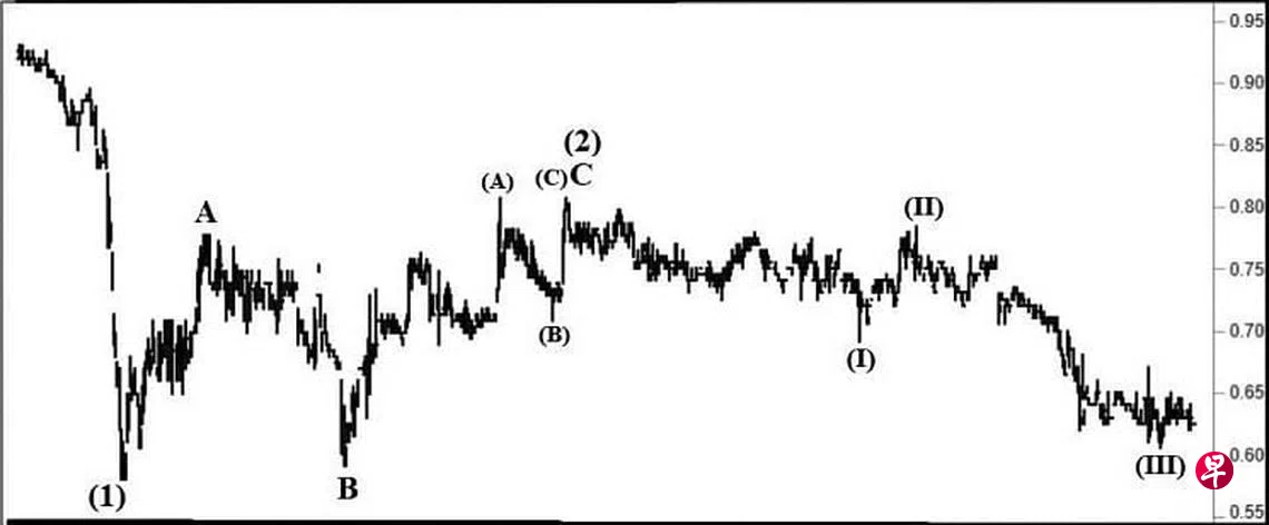 本栏于2021年6月2日曾论及这只股票当时正处(C)波升势,且当填补介于0.84元与0.845元及介于0.86元与0.87元的缺口后,以完成(C)波,同时为C波画下句号后,才重返跌势。当时股价为0.78元左右。实际上,股价于2021年5月28日第二度升试0.81元,就已经完成了(C)波。同时也为(C)波画下句号。这也是股价源自2020年3月24日从0.58元以“主要转向”信号上升以来,三波回扯中C波的终点,同时也是从2017年9月25日自1.26元五波下跌中的第(2)波。因此,股价已经处于第(3)波下跌,而此第(3)波又具五波。去年3月9日股价下跌至0.69元完成了第(I)波,过后以三细波回扯至5月6日的0.78元,此为第(II)波;接着进入具五细波的第(III)波跌势。今年元月20日股价下跌至0.605元,并以“主要转向”信号为第(III)波画下句号。估计股价目前正处第(IV)波回扯以填补介于0.735元与0.75元间的缺口,一旦结束,股价将重返跌势,且当试0.59元的支撑点了。
