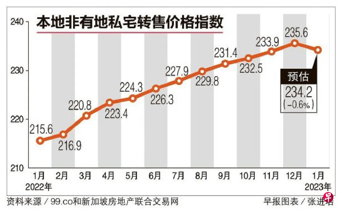房地产网站99.co和新加坡房地产联合交易网SRX星期一(2月27日)发布的预估数据显示,1月份非有地私宅整体转售价自2020年7月以来首次下跌。