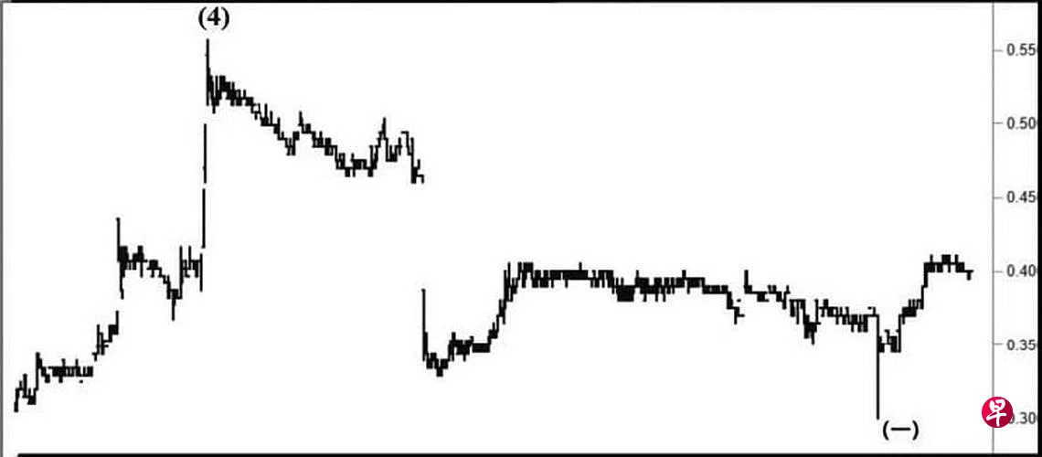 本栏于去年3月30日曾论及这只股票已经形成一个“斜向交叉”,一旦突破位于0.405元的阻力线,填补介于0.40元与0.48元间的缺口当无悬念。当时股价为0.40元左右。同年4月11日股价升试0.405元,无奈过后依然在0.40元及0.39元间摆动;回顾股价自2007年7月10日升试0.75元完成了B大波之后,就进入C大波跌势,而C大波又具三波。2009年3月10日股价下探0.164元结束了(A)波,接着回扯至2011年元月10日的0.68元,此为(B)波,旋进入具五波的(C)波跌势。同年10月3日股价下试0.43元完成了第(1)波,过后回扯至2014年6月11日的0.63元结束了第(2)波。2020年11月5日股价下跌至0.26元完成了第(3)波,2021年6月15日回扯至0.56元结束了第(4)波。因此,目前正处具五细波的第(5)波跌势。去年12月6日股价下试0.30元完成了第(一)细波,因此,估计短期回扯,股价当尝试填补介于0.405元与0.46元间的缺口,以结束第(二)细波,过后向下跌穿0.30元的支撑点。
