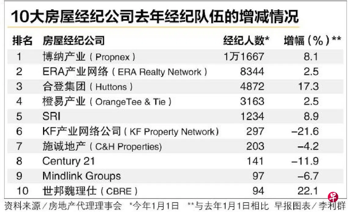 根据房地产代理理事会(CEA)网站和《联合早报》整理的数据,截至今年1月1日,本地共有3万4427个房屋经纪,比去年1月1日多了6.2%;房屋经纪公司则有1118个,同比增加1.5%。