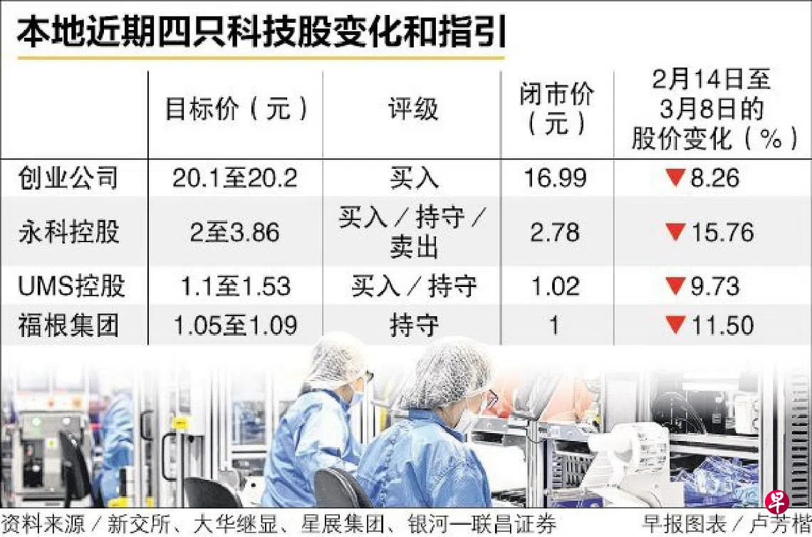 这四只本地科技股是:创业公司(Venture Corp)、永科控股(AEM)、UMS控股(UMS Holdings)及福根集团(Frencken Group)。
