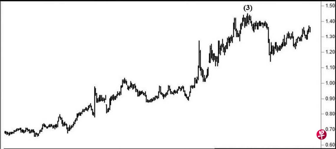 这只股票于2008年10月16日下跌至0.14元后,进入三大波回扯。2011年元月13日股价上升至1.09元,遂于其每月一杆图以“转向”信号完成了A大波,接着进入具三波的B大波下调。同年10月4日股价下试0.40元结束了(a)波,过后回扯至2015年5月22日的0.79元,又以“转向”信号完成了(b)波,旋进入(c)波跌势。2016年9月23日股价下探0.37元结束了(c)波,同时为B大波画下句号,遂进入C大波升势,而C大波又具三波。2017年11月17日股价上升至0.90元完成了(A)波,接着下调至2020年3月13日的0.38元,此为(B)波,旋进入具五波的(C)波升势。2021年8月26日股价上升至0.88元结束了第(1)波,随后回扯至2021年11月10日的0.63元,此为第(2)波。几经反复,股价终在去年12月1日上升至1.45元,同时于其每日及每周一杆图皆以“转向”信号完成了第(3)波。估计股价目前正处第(4)波下调,并可能填补介于1.11元与1.10元间的缺口后,才进入第(5)波升势。
