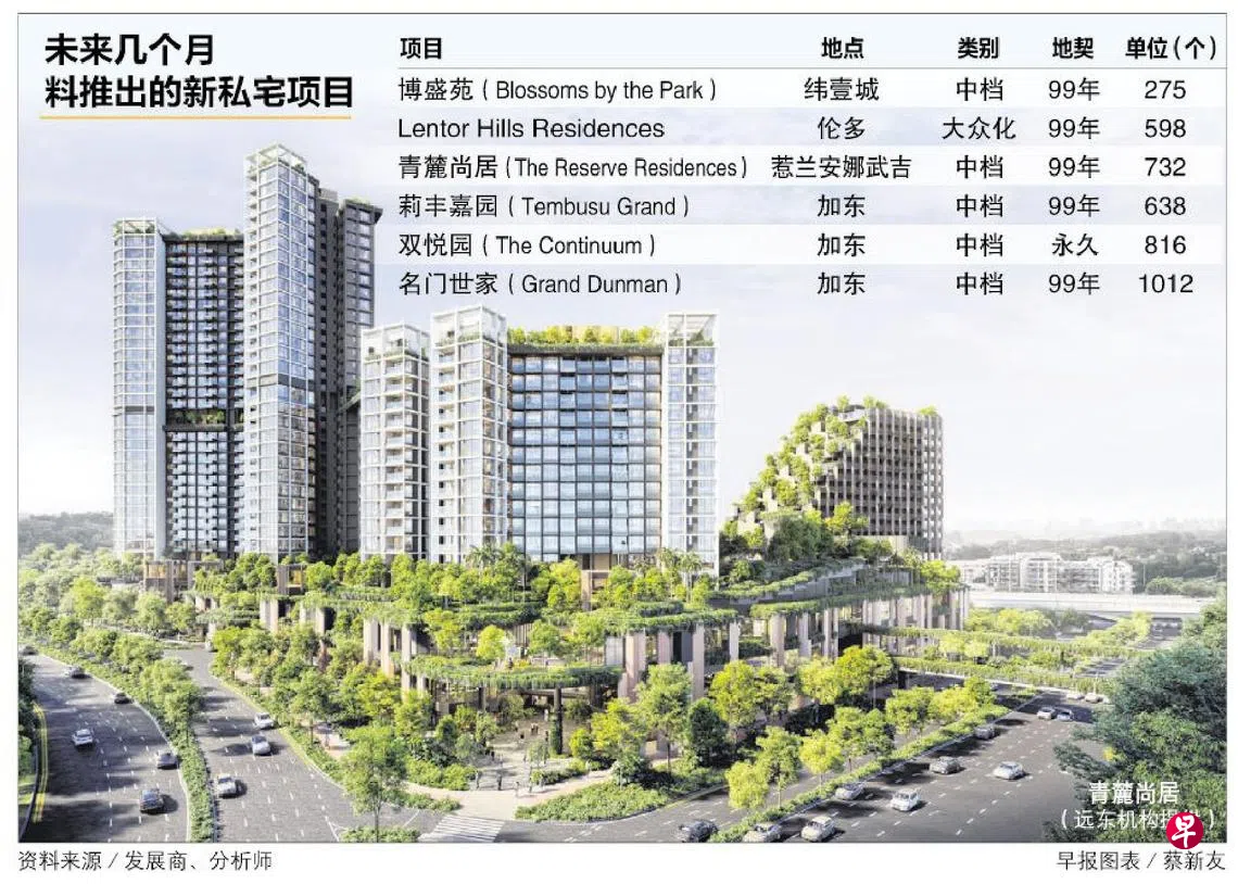 预期在今年3月到6月期间登场的项目,包括纬壹城一带的博盛苑(Blossoms by the Park)、伦多的Lentor Hills Residences、惹兰安娜武吉(Jalan Anak Bukit)的青麓尚居(The Reserve Residences)。还有加东区有好几个项目,如莉丰嘉园(Tembusu Grand)和双悦园(The Continuum)也预计在这期间推出,名门世家(Grand Dunman)则预计在年中推出。