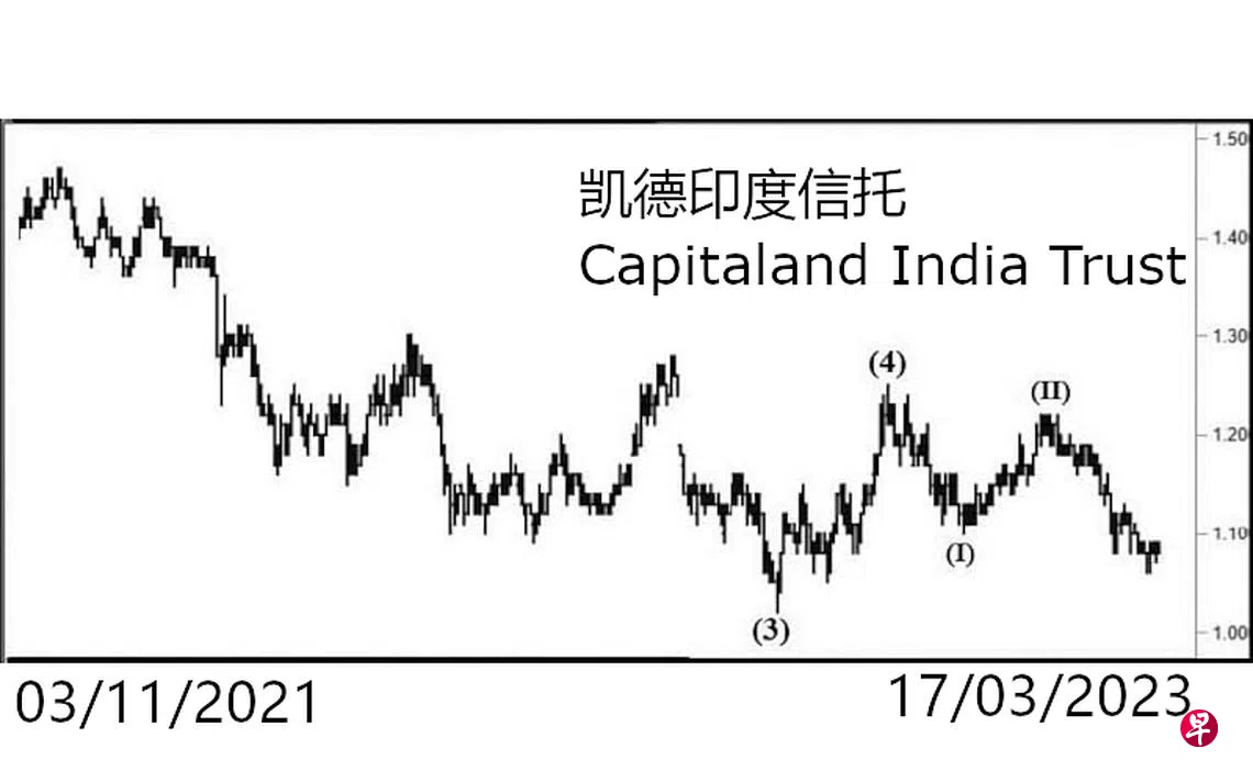 本栏于去年12月21日曾论及这只股票当时正处具三波的第(4)波回扯,估计将升逾1.28元以结束第(4)波,才进入第(5)波跌势。当时股价为1.13元左右。今年1月26日股价升试1.22元,接着又在27日、30日及31日三度试此价位。2月2日股价第五度试此价位未果,立即以“主要转向”信号完成了图中的第(II)波,遂进入跌势。回顾股价于去年9月30日下试1.02元结束了第(3)波后,以三波回扯至同年11月17日的1.25元完成了第(4)波,以致股价未能升逾上述的1.28元的价位,就重返跌势。依此类推,去年12月20日的1.10元应为图中第(5)波的第(I)波,如今股价已经进入第(III)波跌势,2月24日股价骤然下跌至1.10元,同时在介于1.14元与1.16元间出现缺口。3月13日股价下探1.06元,次日,又试此价位未果,估计短期回扯,充其量也只能填补上述缺口,一旦穿下位于1.05元的支撑点,跌穿0.98元的重大支撑点当无悬念了。