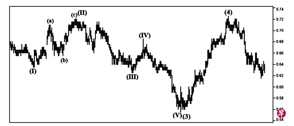 本栏于去年2月23日曾论及这只股票短期回扯当填补介于0.685元与0.68元及介于0.675元与0.66元的缺口,并在突破0.74元的价位后,挑战位于0.85元的阻力点。当时股价为0.70元左右,股价过后缓缓下滑,2月28日下探0.655元,遂将上述二缺口填补;3月15日股价第四度试此价位未果,旋于该周每周一杆图以“主要转向”信号完成了图中的(b)波。4月7日股价上升至0.72元,随即以“转向”信号结束了(c)波,同时为第(II)波画下句号。同年7月21日股价下试0.625元,22日再试此价位未果,遂以“主要转向”信号完成了第(III)波,旋进入第(IV)波回扯。8月11日股价上升至0.685元,此为第(IV)波。10月17日股价下探0.555元,并以“主要转向”信号结束了第(V)波,同时为第(3)波画下句号。今年元月12日股价上升至0.725元,未能突破上述0.74元的价位,遂于当天以“主要转向”信号完成了第(4)波。估计股价已经进入第(5)波跌势,一旦跌穿0.555元的支撑点,当有骤跌。