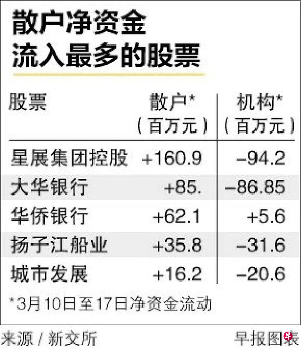 本地股市在3月10日至17日的六个交易日,总共吸引3亿3400万元散户净资金流入,机构净资金则流出1亿3300万元。