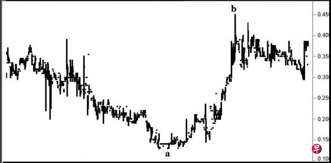 这只股票自2007年7月26日上升至0.77元后,就进入三大波下调走势,其中A大波又可分为三波。2008年7月11日股价下滑至0.36元完成了(A)波,过后回扯至同年7月22日的0.665元,此为(B)波,随即进入具三波的(C)波跌势。2009年7月13日股价下探0.11元完成了(C)波,同时也为A大波画下句号,遂进入具五波升势的B大波。2010年5月4日股价升试0.305元,并以“主要转向”信号完成了第(1)波,过后下调至同年5月26日的0.19元,此为第(2)波。2011年元月19日股价上升至0.625元结束了第(3)波,随即下调至同年3月3日的0.505元,同时以“主要转向”信号完成了第(4)波。2011年4月29日股价上升至0.725元结束了第(5)波,同时为B大波画下句号,旋进入具三波的C大波跌势。2019年2月22日股价下探0.129元完成了a波,接着回扯至2021年4月20日的0.45元结束了b波。估计股价目前正处c波跌势,填补介于0.195元与0.151元间的缺口自不在话下。