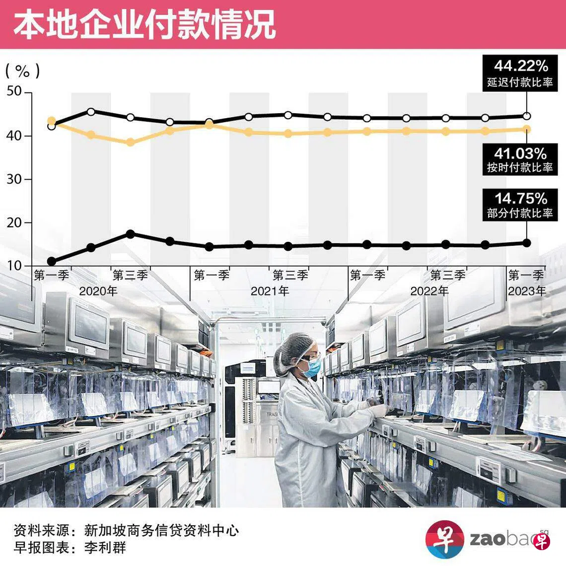 新加坡商务信贷资料中心(Singapore Commercial Credit Bureau)星期二(4月4日)发布最新季度数据显示,本地企业今年首季的延迟付款比率环比上升0.07个百分点至44.22%,同比增幅也是0.07个百分点。