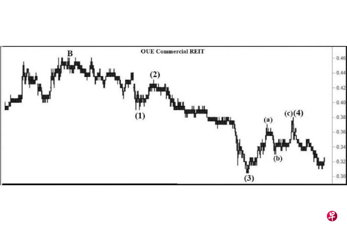 本栏于去年12月17日曾论及这只股票已经在12月1日上升至0.37元,并以“转向”信号结束了第(4)波。估计股价已经进入第(5)波跌势,跌穿0.305元是理所当然,最终或将在0.28元之下完成第(5)波才重返升势。当时股价位在0.335元左右。实际上,上述的0.37元不是第(4)波,而是具三波回扯的第(4)波中的(a)波。12月20日股价下试0.33元,遂于当天以“转向”信号完成了(b)波,过后进入(c)波升势。今年元月30日股价上升至0.38元,不但结束了(c)波,同时于其每周一杆图以“转向”信号为第(4)波画下句号。2月6日股价下跌至0.35元,同时在介于0.355元与0.36元间留下缺口。截至3月23日股价已经下探0.31元。又于三大波下跌始于2018年2月1日的0.67元,期间A大波止于2020年3月19日的0.28元,接着以三波回扯至2021年10月11日的0.46元,且于当天以“转向”信号结束了B大波,而C大波又具五波,估计第(5)波当跌穿0.305元,最终或将在0.28元之下。