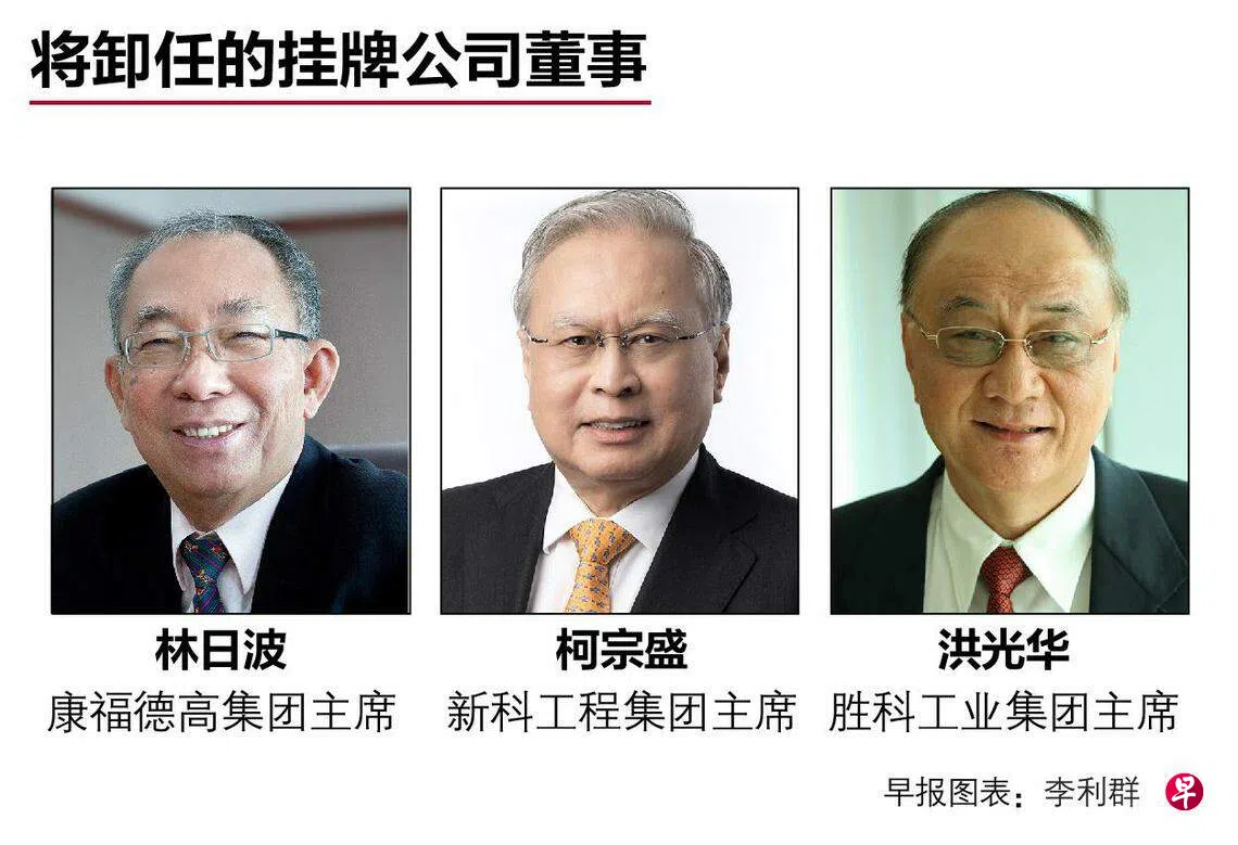 将在4月股东大会卸任(不寻求再度当选)的上市公司董事包括康福德高集团(ComfortDelGro)主席林日波、新科工程(ST Engineering)主席柯宗盛和胜科工业(Sembcorp Industries)集团主席洪光华。