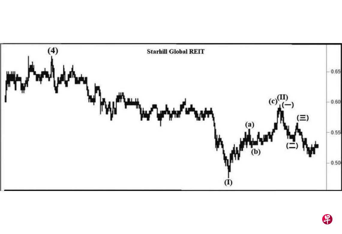 本栏于去年10月27日曾论及这只股票由于第(4)波已经在2021年11月25日的0.675元完成,因此股价当时正处第(5)波跌势,那时股价为0.495元左右。由于第(5)波中的第(I)波已经在去年10月21日的0.475元结束了,因此股价当时正处具三波回扯的第(II)波。11月29日股价上升至0.555元,30日股价再度试此价位未果,遂于当天以“主要转向”信号完成了图中的(a)波;过后下调至12月2日的0.525元,此为(b)波。今年元月30日股价上升至0.595元,并于当天以“转向”信号结束了(c)波,同时为第(II)画下句号;因此,股价目前已经进入一个具“斜向交叉”的第(III)波跌势。2月22日股价下试0.535元,次日,再试此价位未果,24日股价第三度试此价位后,旋以“主要转向”信号完成了上图中的第(二)点,接着回扯至3月2日的0.565元结束了第(三)点。估计股价最终将跌穿位于0.475元的支撑点,朝0.40元的重大支撑点前进。