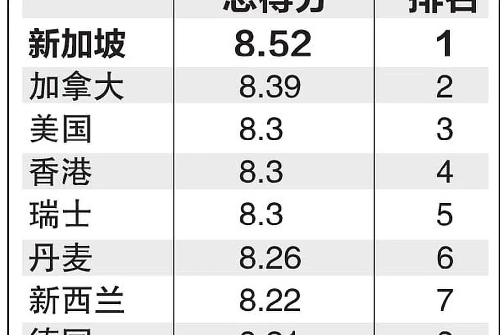 根据经济学人智库的2023年第二季经商环境排名(business environment rankings),新加坡在82个国家和地区中脱颖而出,加拿大和丹麦也有突出的经济表现和稳定的政治环境,排名紧随新加坡之后。