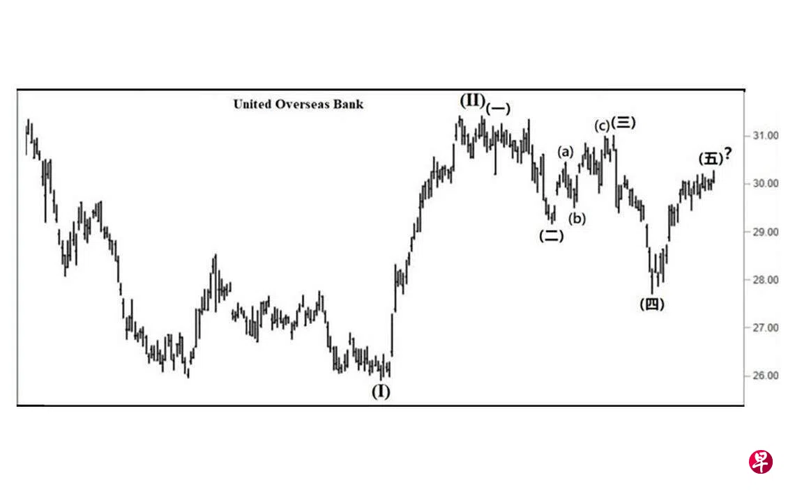 本栏于去年12月10日曾论及这只股票的第(II)波回扯随时会结束,迄时股价当下填补介于28.59元与28.50元及介于26.41元与26.02元间的缺口。当时股价为30.73元左右。12月13日股价再度回升至31.40元,并于该周每周一杆图以“转向”信号完成了上述的第(II)波回扯,过后渐渐进入第(III)波跌势,同时形成了一个跌势“斜向交叉”。1月19日股价下试29.16元结束了上图中的第(二)点,旋进入三波回扯。1月30日股价上升至30.45元,随即以“主要转向”信号完成了(a)波,2月2日股价下跌至29.50元,此为(b)波。2月22日股价回升至31.00元结束了(c)波,同时为第(三)点画下句号,接着迅速滑落。3月14日股价下探27.71元,旋将上述第一个缺口填补,同时为第(四)点画下句号,截至4月14日股价已经回扯至30.27元,估计第(五)点随时会结束。若以上图第(三)及第(四)点价差,计自第(五)点,可测得基本目标为26.98元。