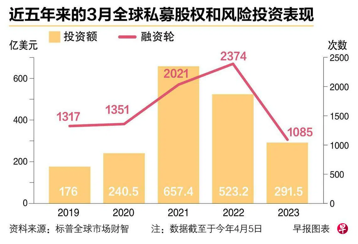 标准普尔全球市场情报(S&P Global Market Intelligence)的数据显示,今年3月全球私募股权和风险投资额同比大幅下降44.3%,报291亿5000万美元(约386亿零900万新元)。3月的投资也从去年同期的2374轮,下滑至1085轮。