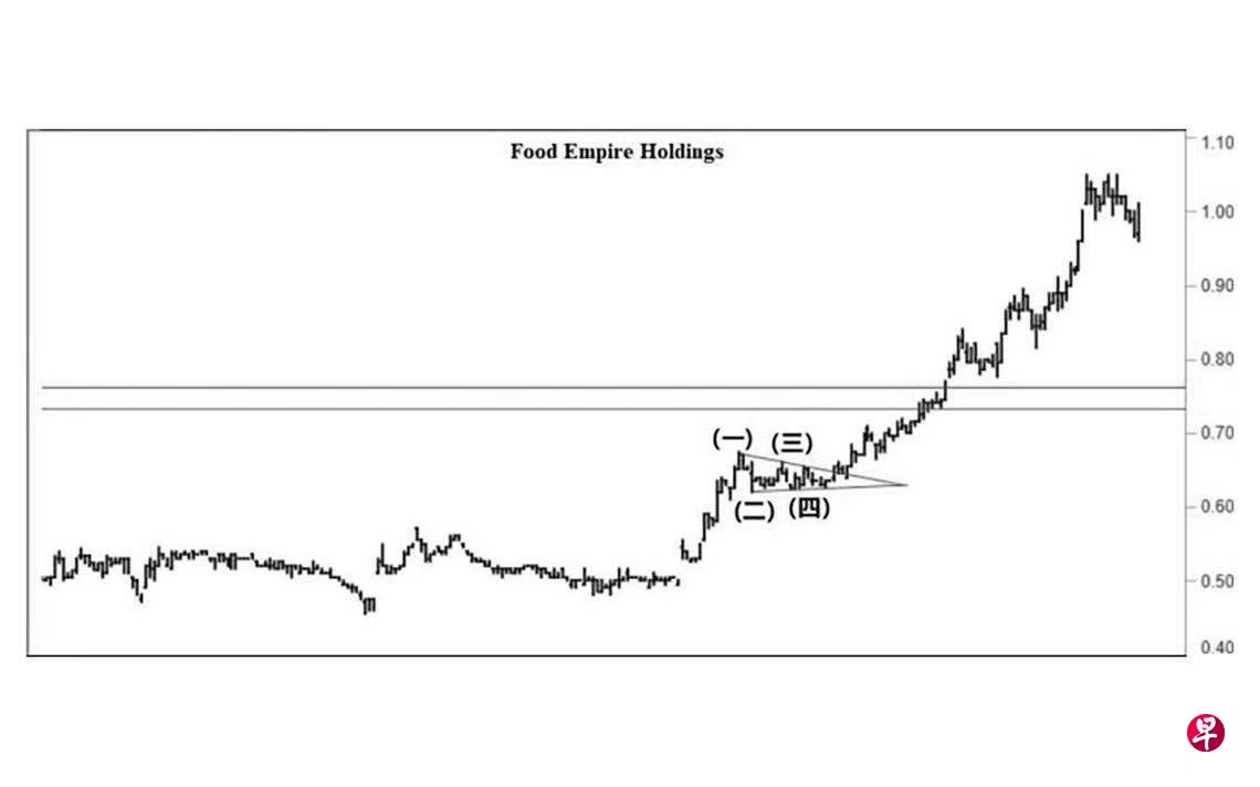本栏于去年12月2日曾论及这只股票截至11月30日已经升试0.675元,至于能否挑战位于0.73元及0.76元的阻力线,投资者得拭目以待。当时股价为0.66元左右,可是股价并没有立即上升,而是渐渐形成一个升势“三角形”。12月5日股价下试0.62元完成了第(二)点,过后回升至12月14日的0.66元,结束了第(三)点。12月19日股价下试0.625元完成了第(四)点,且于当天以“主要转向”信号止跌回升。今年元月4日,股价上升,突破位于0.65元的“三角形”上限,直试0.66元;元月9日股价进一步上升至0.685元,过后循序渐升。2月10日股价终于上升突破上述位于0.73元及0.76元的阻力线,直抵0.77元的价位。2月13日股价骤升至0.795元,同时在介于0.775元与0.765元间留下缺口;14日股价跳空升试0.805元,又在介于0.78元与0.775元间留下缺口,此后几经反复,3月29日股价升试1.05元,4月10日第三度试此价位未果;短期回扯,股价或将向下填补介于0.795元与0.785元间的缺口后,重返升势。